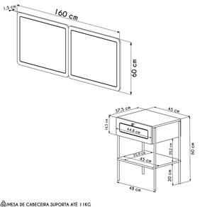 Cabeceira:160 x 60 x 1,5 cm. Mesa de Cabeceira: 48 x 60 x 37 cm. Peso:12Kg.