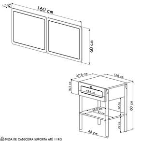 Cabeceira:160 x 60 x 1,5 cm. Mesa de Cabeceira: 48 x 60 x 37 cm. Peso:12Kg.