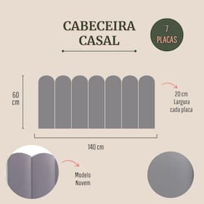 CONFIRA ABAIXO MAIS DETALHES SOBRE O PRODUTO: Tamanho Casal (7 placas): 140cm (comprimento total) x 60cm (altura) x 3 cm (profundidade). Altura de cada placa: 60 cm Largura de cada placa: 20cm Materiais: 100% MDF; Espuma; Fita 3M; Cores e Tecidos: temos 25 variações de cores e tecidos. Escolha a que você mais gosta.