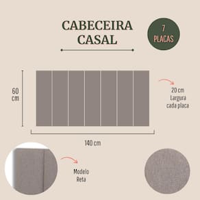 CONFIRA ABAIXO MAIS DETALHES SOBRE O PRODUTO: Tamanho Casal (7 placas): 140cm (comprimento total) x 60cm (altura) x 3 cm (profundidade). Altura de cada placa: 60 cm Largura de cada placa: 20cm Materiais: 100% MDF; Espuma; Fita 3M; Cores e Tecidos: temos 25 variações de cores e tecidos. Escolha a que você mais gosta.