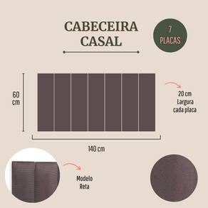 CONFIRA ABAIXO MAIS DETALHES SOBRE O PRODUTO: Tamanho Casal (7 placas): 140cm (comprimento total) x 60cm (altura) x 3 cm (profundidade). Altura de cada placa: 60 cm Largura de cada placa: 20cm Materiais: 100% MDF; Espuma; Fita 3M; Cores e Tecidos: temos 25 variações de cores e tecidos. Escolha a que você mais gosta.