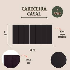 Tamanho Casal (7 placas): 140cm (comprimento total) x 60cm (altura) x 3 cm (profundidade).