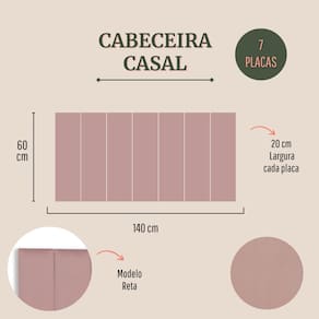 CONFIRA ABAIXO MAIS DETALHES SOBRE O PRODUTO: Tamanho Casal (7 placas): 140cm (comprimento total) x 60cm (altura) x 3 cm (profundidade). Altura de cada placa: 60 cm Largura de cada placa: 20cm Materiais: 100% MDF; Espuma; Fita 3M; Cores e Tecidos: temos 25 variações de cores e tecidos. Escolha a que você mais gosta.