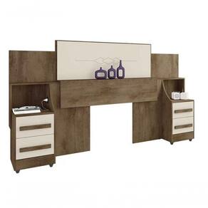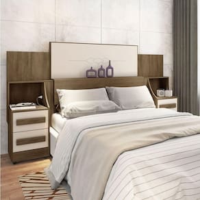Puxadores em MDF, mesas de cabeceira com corrediças telescópicas e duas tomadas inclusas.