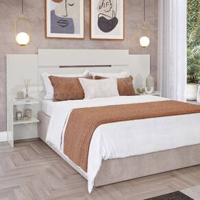 A Cabeceira Casal Extensivel com 2 Prateleiras Lateral em MDF Mila Panan e compacta e versatil que pode ser montado para 3 tamanhos de colchao box: Solteiro, Casal e Queen. Possui criados laterais que ocupam pouco espaco, mas sao bem uteis para apoio de luminarias ou outros objetos.