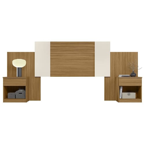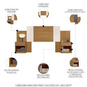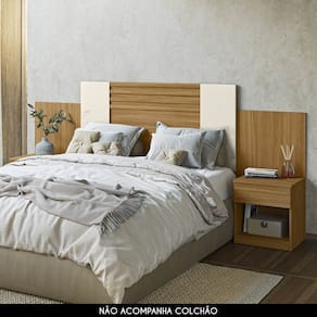 Características do Produto Material da estrutura: MDP/MDF. Espessura das Chapas: 12mm/15mm. Peso Suportado: 18 kg distribuídos. Acabamento: Pintura UV. Escala de Brilho: Acetinado. Possui Pés: Sim. Tipo de Pés: Sapatas plásticas. Possui Gaveta: Sim. Quantidade de Gavetas: 2 Gavetas. Tipo de Corrediças: Telescópicas. Possui Puxador: Não. Possui Nicho: Sim. Quantidade de Nichos: 2 Nichos. Possui Porta: Não. Possui Prateleira: Não. Diferenciais: - Design moderno. - Cabeceira extensível. - Mesas laterais acopladas. - Gavetas com corrediças telescópicas. - Indicada para colchões de 138 e 158cm. Sistema de Montagem: Girofix/Cavilhas/Parafusos. Manual de Montagem: Sim. Complexidade da Montagem: Média. Conteúdo da Embalagem: 1 Cabeceira. Volumes: 2 Volumes. Garantia do Fabricante: 90 dias contra defeitos de fabricação. Montagem: Recomendamos que seja feita por um profissional. Recomendação de limpeza: Utilize pano levemente úmido.