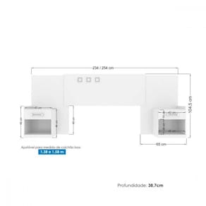 Cabeceira Casal Havana Plus com Mesa de Cabeceira Santos AndiráCaracterísticas:2 gavetas com corrediças metálicas, amplo espaço que deslizam suavemente sem enrosco.Estrutura em 15 e 12mm, design diferenciado e muita resistência.Medida para colchão Box 1,40 e 1,60m.Não é necessário parafusar na parede.Permite ser desmontado e montado até cinco vezes.Cabeceira Laterais ext Tampo Frentes de gaveta Prateleiras: MDP 15mm com aplicação.Traseiro de gaveta, Base inf: MDP 15mm com aplicação.Fundo da Mesa de Cabeceira: MDP 12mm Bordos: Acabamento Reto.Não Limpar com álcool ou qualquer produto químico.Utilize somente pano seco ou levemente umedecido.Dimensões:Altura: 104 cmLargura: 254 cmProfundidade: 39 cmPeso: 38,100 kgManutenção: Não limpar com álcool ou qualquer outro produto químico, utilize somente pano seco ou levemente umedecido.Garantia de Fábrica: 03 Meses (90 dias).