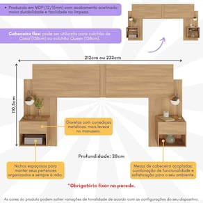 A cabeceira ajustável pode ser utilizada com colchões de Casal (138cm) ou Queen (158cm), garantindo um encaixe perfeito em qualquer decoração. As 2 mesas de cabeceira acopladas possuem nichos e gavetas com corrediças metálicas, para uma abertura suave, proporcionando amplo espaço para manter seus objetos organizados e sempre ao alcance.