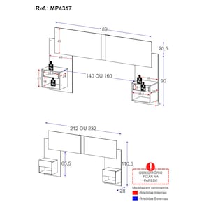 Altura: 110,5cm | Largura: 212 ou 232cm | Profundidade: 28cm