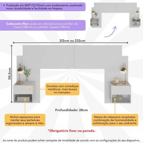 A cabeceira ajustável pode ser utilizada com colchões de Casal (138cm) ou Queen (158cm), garantindo um encaixe perfeito em qualquer decoração. As 2 mesas de cabeceira acopladas possuem nichos e gavetas com corrediças metálicas, para uma abertura suave, proporcionando amplo espaço para manter seus objetos organizados e sempre ao alcance.