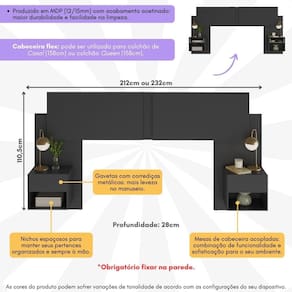 Altura: 110,5cm | Largura: 212 ou 232cm | Profundidade: 28cm
