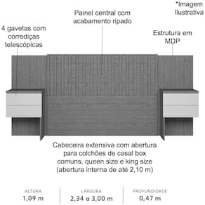 - Cabeceira extensiva com abertura para colchões de casal box comuns, queen size e king size (abertura interna de até 2,10 m);