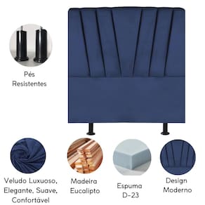 Estrutura: Madeira Eucalipto de alta qualidade Tecido: Veludo Espuma: D-23 Material dos pés: Plástico Não acompanha o kit frame Os parafusos para fixação do frame e os pés serão enviados dentro do forro, na parte de trás da cabeceira Montagem: O produto vai montado, necessitando apenas rosquear os pés (2) Instruções de Limpeza: Utilizar um pano limpo e levemente úmido Você irá receber: 01 volume