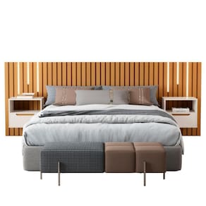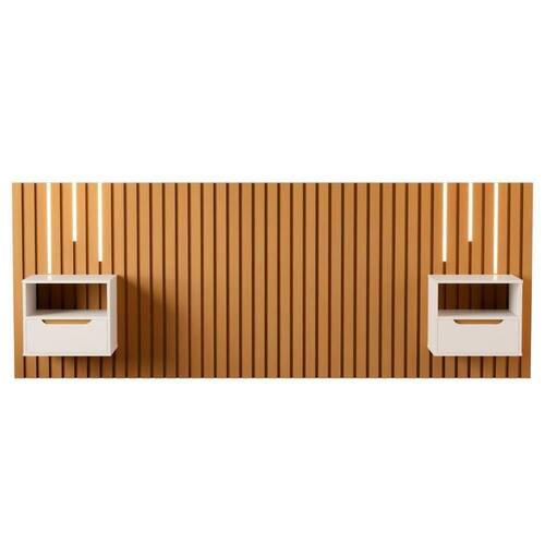 Feita em MDP/MDF 24mm. Acompanha 1 Kit de LED e 2 mesas de cabeceira suspensa. Comporta cama de 158x198 cm.