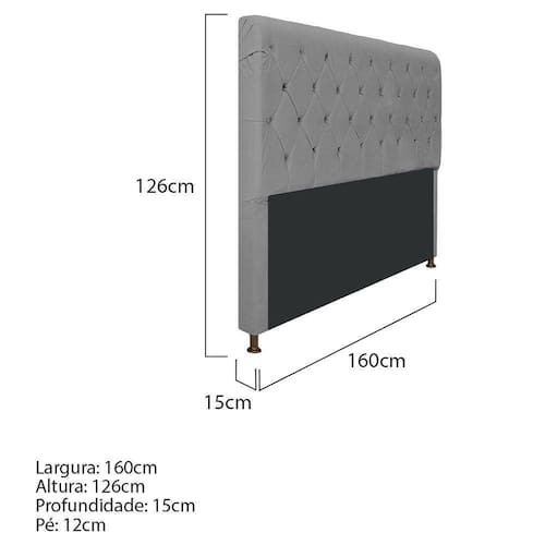 A Cabeceira Cristal é perfeita! Ela agrega sofisticação ao seu quarto e com seus detalhes em capitonê e seu tecido de alta qualidade, faz com que sua decoração fique impecável! Especificações Técnicas da Cabeceira Estofada Cristal: - Altura: 126 cm; - Largura: 160 cm; - Profundidade: 15 cm; - Altura do Pé: 12 cm; - Peso: 20 kg. Diferenciais da Cabeceira Estofada Cristal: - Material da Estrutura: fabricado com Madeira Pinus e Eucalipto Reflorestada, e alguns detalhes em MDF; - Detalhes do Tecido: possui detalhes em Capitonê, onde os botões são revestidos no mesmo tecido do produto e finalizados com excelente acabamento; - Detalhes dos Pés: acompanha kit de pés (2 pés) com alta resistência; - Volumes: nessa compra você receberá um único produto. Recomendações de limpeza: -Limpar com flanela limpa e seca. Não molhar o móvel e não expor em lugar úmido ou próximo de fontes de calor. Não usar produtos abrasivos. Observações Importantes: - As imagens ambientadas são meramente ilustrativas e podem apresentar itens que não compõe o produto; - Objetos decorativos que aparecem na foto não acompanham o produto; - As cores do produto podem variar de acordo com o monitor, a iluminação do ambiente, ou sua percepção visual; - A Cabeceira Estofada Cristal chegará montada para você, bastando rosquear os pés; - Confira as dimensões antes da compra e certifique-se de que o produto passará por elevadores, portas e corredores, já que nossa entrega não inclui a subida de lances de escada, ou o lançamento de produtos; - Ao receber seus produtos, verifique no ato do recebimento qualquer dano na embalagem. Caso tenha alguma avaria, favor não assinar o comprovante de recebimento (A transportadora tem obrigação de esperar a conferência); - Produto para uso residencial em ambiente interno, não devendo ficar exposto diretamente ao sol, calor e umidades excessivas.