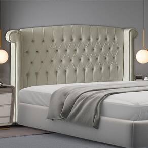 Essa cabeceira casal estofada é um Luxo só, isso porque o seu design curvo somado aos botões revestidos cria um ambiente clássico e charmoso.