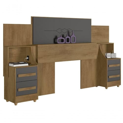 Cabeceira De Casal Extensível Síria Cinamomo Com Grafite - Rv Móveis A Cabeceira de Casal Síria - RV Móveis é o produto mais indicado para quem deseja beleza e conforto enquanto aproveita seu momento de descanso. Possui dois criados com gavetas com corrediças telescópicas e puxadores em MDF, além de tomadas embutidas. Conta também com design moderno, sem deixar de lado requinte e sofisticação.Dimensões do Produto Montado:Altura: 137,5 cmLargura: 227/247/267 cmProfundidade: 37 cmObservações:- Adaptável para box de 1,40, 1,60, 1,90 e 2m;- Painéis em MDF;- Criados com Corrediças telescópicas;- Puxadores em MDF;- 2 Tomadas inclusas;- Pintura Ultravioleta com acabamento fosco na cor grafite;- Pintura Ultravioleta com acabamento amadeirado na cor cinamomo.