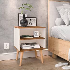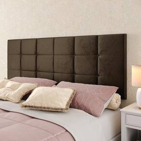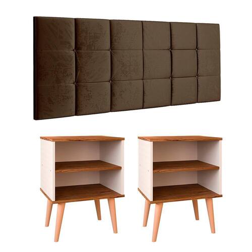 Cabeceira Estofada Cama Box Queen Bia 1,60 Marrom Suede Kit 2 Mesinhas Nicho Prateleira Pés Palito Retrô Quarto Casal Off White/Freijó - RPM