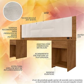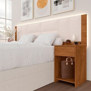 A Cabeceira Estofada Mumbai com design elegante, ela conta com iluminação em LED, criando uma atmosfera acolhedora. As mesas de cabeceira com gaveta oferecem praticidade e organização.