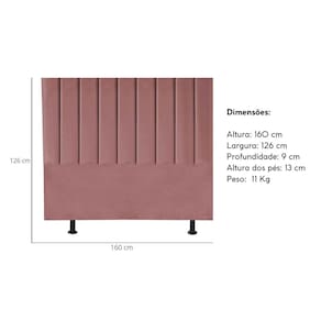 Transforme sua decoração com a elegância Cabeceira Casal Queen Estofada Mavie Carla!    Ideal para quem busca estilo e conforto, Cabeceira Cama Box Mavie Carla é o toque perfeito para o seu quarto.   Com um design único e detalhes que encantam, Cabeceira Moderna Mavie Carla é a escolha certa para acompanhar sua cama e garantir momentos de relaxamento ainda mais aconchegantes. Seja para apoiar as costas enquanto lê um livro ou assistir TV, ela proporciona conforto incomparável.   Fabricada com materiais de alta qualidade, como madeira eucalipto e revestimento em veludo, esta cabeceira é durável e resistente, garantindo não apenas estilo, mas também funcionalidade para o seu ambiente.   Não perca tempo! Adquira já a sua Cabeceira Alta Box Mavie Carla e transforme seu quarto em um espaço ainda mais acolhedor. Aproveite agora mesmo!   Dimensões:     Altura: 126 cm Largura: 160 cm Profundidade: 10 cm Altura dos pés: 13 cm Peso: 11 Kg     Especificações do Produto:     Estrutura: Madeira Eucalipto de alta qualidade Tecido: Veludo Espuma: D-20 Material dos pés: Plástico Acompanha o kit frame Os parafusos para fixação do frame e os pés serão enviados dentro do forro, na parte de trás da cabeceira Montagem: O produto vai montado, necessitando apenas rosquear os pés (2) Instruções de Limpeza: Utilizar um pano limpo e levemente úmido Você irá receber: 01 volume     Observações Relevantes:     Produto para uso residencial em ambiente interno, não devendo ficar exposto diretamente ao sol, calor e umidades excessivas; As imagens são meramente ilustrativas, não acompanham objetos de decoração e eletros;    Cabeceira casal rainha  Cabeceira camurça Cabeceira rústica Cabeceira retrô Cabeceira sob medida Cabeceira embutida Cabeceira rainha  Cabeceira moderna Cabeceira camurça  Cabeceira rainha retrô