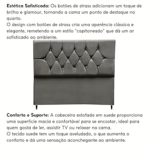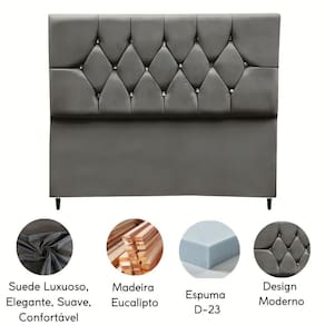 Fabricada com materiais de alta qualidade, como madeira eucalipto e revestimento em Suede, esta cabeceira é durável e resistente, garantindo não apenas estilo, mas também funcionalidade para o seu ambiente.