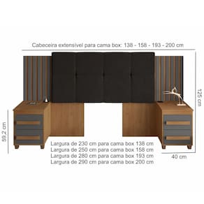 Largura: 230 cm para cama box de 138 cmLargura: 250 cm para cama box de 158 cmLargura: 280 cm para cama box de 193 cmLargura: 290 cm para cama box de 200 cmAltura: 125 cmProfundidade: 35 cmPeso: 44,3 KgGarantia: 03 MesesInformações Adicionais: Não possuímos serviço de montagem. Todos os móveis possuem garantia e manual de montagem, Não nos responsabilizamos pelos custos de montagem. É de extrema importância ficar atento às dimensões dos produtos, pois é de sua total responsabilidade caso o produto tenha dimensões superiores ao local de acesso da entrega dificultando ou impossibilitando que a mesma seja concluída. Não nos responsabilizamos, no ato da entrega, por subir escadas, corredores e elevadores ou transporte por guincho em apartamentos. Não nos responsabilizamos por transtornos com a entrega caso o produto necessite de desmontagem, nem pelos custos gerados por esta situação. Imagens meramente ilustrativas a cor, pode variar de acordo com a iluminação do ambiente. Itens de decoração não inclusos.