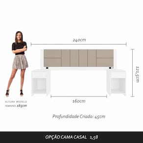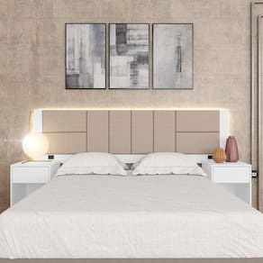 A Cabeceira Dubai com mesas laterais une praticidade e conforto. O grande destaque é o painel almofadado trazendo modernidade e beleza.Detalhes Técnicos:Medidas da Cabeceira montada: A:121,5cm | L:240cm | P:45cmMateriais de Fabricação:- Chapa MDP 15mm- Revestimento: Pintura UV-Tonalidade: Branco-Tonalidade do tecido : Suede Bege- Corrediça MetálicaAcompanha : Led e tomadas de energia (tomada para produtos de baixa potência)- Sapatas plásticas-Medida para cama: 158cm- Estruturado com material de altíssima qualidade, evitando fungos e mofo.Conteúdo da Embalagem:- 01 Cabeceira- Plástico protetor- Caixa papelão- Acessório para Montagem: Cavilhas, Parafusos, Sache de cola, Etiqueta, Tapa furo.Observações Importantes:- As imagens ambientadas são meramente ilustrativas e podem apresentar itens que não incorporam o produto;- Todos os nossos produtos são novos, acompanham documento fiscal e possuem garantia de 3 meses, essa garantia cobre somente defeitos de fabricação;- A entrega só será efetuada no endereço do CEP, caso o endereço seja diferente do CEP informado no pedido, a entrega terá cobrança adicional e o comprador arcará com as despesas;- Não realizamos entregas para zonas rurais, via caminhos fluviais e distritos, por isso não aceitamos CEP GERAL da região;- Não é possível realizar o agendamento de entrega do produto, é necessário que acompanhe o rastreio de seu pedido para saber a previsão de entrega;- As entregas somente serão realizadas para um responsável maior de idade (+18);- Enviamos para diversos estados, sendo assim nossas entregas são realizadas por transportadoras parceiras de nossa empresa. Confira as dimensões antes da compra e certifique-se de que o produto passará por elevadores, portas e corredores já que nossa entrega não inclui a subida de lances de escada, transporte por elevador e o lançamento de produtos, em caso de condomínios residenciais a entrega é feita somente até a portaria. Todas as entregas são realizadas em dias e horários comerciais;- Ao receber os seus produtos observe se a embalagem se encontra em perfeitas condições. Se você adquiriu algum móvel, confira atentamente a quantidade de volumes e o aspecto físico das embalagens. Confira também se a cor do móvel está de acordo com o seu pedido;- O prazo de cancelamento por arrependimento é de até 7 dias corridos a contar da data de recebimento;- Os produtos e assistências são enviados DESMONTADOS, MONTAGENS E DESMONTAGENS recomendamos sempre a contratação de um montador profissional e é válido lembrar que o custo desses serviços é por conta do comprador;- Objetos decorativos que aparecem na foto não acompanham o produto;- Evitar a exposição direta à luz solar e à umidade;- Para limpeza, limpar com pano macio e seco, não utilizar qualquer outro tipo de produtos químicos;- As cores do produto podem variar de acordo com o monitor, a iluminação do ambiente ou sua percepção visual;