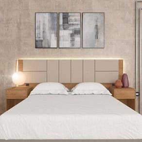 A Cabeceira Dubai com mesas laterais une praticidade e conforto. O grande destaque é o painel almofadado trazendo modernidade e beleza.Detalhes Técnicos:Medidas da Cabeceira montada: A:121,5cm | L:240cm | P:45cmMateriais de Fabricação:- Chapa MDP 15mm- Revestimento: Pintura UV-Tonalidade: Carvalho americano-Tonalidade do tecido : Suede Bege- Corrediça MetálicaAcompanha : Led e tomadas de energia (tomada para produtos de baixa potência)- Sapatas plásticas-Medida para cama: 158cm- Estruturado com material de altíssima qualidade, evitando fungos e mofo.Conteúdo da Embalagem:- 01 Cabeceira- Plástico protetor- Caixa papelão- Acessório para Montagem: Cavilhas, Parafusos, Sache de cola, Etiqueta, Tapa furo.Observações Importantes:- As imagens ambientadas são meramente ilustrativas e podem apresentar itens que não incorporam o produto;- Todos os nossos produtos são novos, acompanham documento fiscal e possuem garantia de 3 meses, essa garantia cobre somente defeitos de fabricação;- A entrega só será efetuada no endereço do CEP, caso o endereço seja diferente do CEP informado no pedido, a entrega terá cobrança adicional e o comprador arcará com as despesas;- Não realizamos entregas para zonas rurais, via caminhos fluviais e distritos, por isso não aceitamos CEP GERAL da região;- Não é possível realizar o agendamento de entrega do produto, é necessário que acompanhe o rastreio de seu pedido para saber a previsão de entrega;- As entregas somente serão realizadas para um responsável maior de idade (+18);- Enviamos para diversos estados, sendo assim nossas entregas são realizadas por transportadoras parceiras de nossa empresa. Confira as dimensões antes da compra e certifique-se de que o produto passará por elevadores, portas e corredores já que nossa entrega não inclui a subida de lances de escada, transporte por elevador e o lançamento de produtos, em caso de condomínios residenciais a entrega é feita somente até a portaria. Todas as entregas são realizadas em dias e horários comerciais;- Ao receber os seus produtos observe se a embalagem se encontra em perfeitas condições. Se você adquiriu algum móvel, confira atentamente a quantidade de volumes e o aspecto físico das embalagens. Confira também se a cor do móvel está de acordo com o seu pedido;- O prazo de cancelamento por arrependimento é de até 7 dias corridos a contar da data de recebimento;- Os produtos e assistências são enviados DESMONTADOS, MONTAGENS E DESMONTAGENS recomendamos sempre a contratação de um montador profissional e é válido lembrar que o custo desses serviços é por conta do comprador;- Objetos decorativos que aparecem na foto não acompanham o produto;- Evitar a exposição direta à luz solar e à umidade;- Para limpeza, limpar com pano macio e seco, não utilizar qualquer outro tipo de produtos químicos;- As cores do produto podem variar de acordo com o monitor, a iluminação do ambiente ou sua percepção visual;