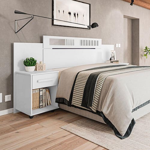 CARACTERISTICAS Altura: 125 cm Largura: Solteiro – 170 cm | Casal – 220 cm | Queen – 240 cm Gavetas: 01 por Mesa de Cabeceira Puxador: Externo Pés: Sim Material: Misto (MDP/MDF) Acabamento: Pintura Necessita Montagem: Sim Ambiente: Quarto Itens Inclusos: 1 Cabeceira e 1 Manual de Instalação Recomendações de Uso, Manutenção e Limpeza: Limpeza deve ser feita com pano seco.
