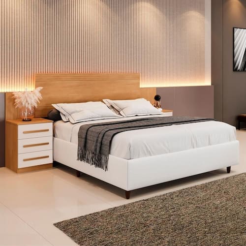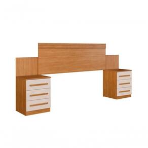 O design completo inclui duas mesas de cabeceira acopladas, cada uma com 3 gavetas espaçosas e corrediças telescópicas, proporcionando ótimo aproveitamento de espaço para organizar objetos pessoais com praticidade.