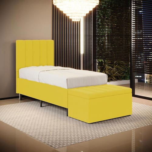 O Kit Cabeceira Nashira e Calçadeira Navi foi inspirada para você, que busca conforto e elegância. Possui um design único e detalhes que dão um toque de sofisticação e um ótimo acabamento, tudo isso com ótimo custo benefício. Possui dois pés de 12 cm e fixação via frames para a sustentação do box, não sendo necessário furar a sua cama, apenas encaixa-la nos suportes da cabeceira. A Calçadeira possui uma ótima capacidade de armazenamento interno, podendo armazenar cobertores, almofadas, entre outros. Adquira já!Dimensões do CabeceiraLargura: 90 cmAltura: 127 cmProfundidade: 10 cmPeso: 10 KgDimensões da CalçadeiraLargura: 90 cmAltura: 45 cmProfundidade: 46 cmPeso: 10 kgDimensões do Produto EmbaladoVolume 1Largura: 92 cmAltura: 129 cmProfundidade: 12 cmPeso: 12 KgVolume 2Largura: 92 cmAltura: 47 cmProfundidade: 48 cmPeso: 12 kgCaracterísticas do Produto:Madeira de eucalipto proveniente de reflorestamentoFixação com grampos galvanizadosEspuma Poliuretano D20Revestimento: SuedCor: AmareloTamanho: Solteiro para cama box de 88 cmPossui pés: SimTipo de pés: 2 pés PVC de 12 cm e 4 sapatasEmbalagem: plástico bolha, papelão ondulado, malha, plásticoFixação diretamente no box através de framesGarantia de 3 meses contra defeitos de fábrica.Diferenciais: - Madeira de alta qualidade- Design moderno- Material resistente- Ótimo acabamento- Estrutura reforçadaSistema de Montagem: O produto é enviado montado, sendo necessário apenas a fixação dos frames e pés.Manual de Montagem: SimVolume: 2 VolumesMontagem: Recomendamos que seja feita por um profissionalRecomendação de Limpeza: Utilize pano levemente úmidoObservações importantes- Produto para uso residencial em ambiente interno, não devendo ficar exposto diretamente ao sol, calor e umidades excessivas.- Pode haver alguma diferença de tonalidade entre a imagem e o produto real, por conta do tratamento de imagens e a calibração de cores do seu monitor.- As imagens são meramente ilustrativas, não acompanham objetos de decoração e eletrônicos.