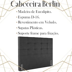 Cabeceira Queen 158 cm Berlin Veludo, ideal para inovar o seu quarto com toque luxuoso e ao mesmo tempo refinado. Estrutura em madeira de eucalipto, que oferece maior durabilidade ao produto. Composta por revestimento em tecido veludo, conta com espuma D-16 de altíssima qualidade, sapatas plásticas e acompanha frames para facilitar a fixação no box, é ideal para colchão Queen de 158 cm. Unindo elementos do design contemporâneo, que proporcionam uma ambientação moderna e com acabamentos sofisticados. Este móvel chegará na sua casa separado em 01 volume.