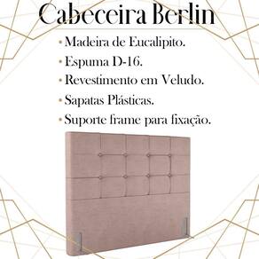 Cabeceira Queen 158 cm Berlin Veludo, ideal para inovar o seu quarto com toque luxuoso e ao mesmo tempo refinado. Estrutura em madeira de eucalipto, que oferece maior durabilidade ao produto. Composta por revestimento em tecido veludo, conta com espuma D-16 de altíssima qualidade, sapatas plásticas e acompanha frames para facilitar a fixação no box, é ideal para colchão Queen de 158 cm. Unindo elementos do design contemporâneo, que proporcionam uma ambientação moderna e com acabamentos sofisticados. Este móvel chegará na sua casa separado em 01 volume.