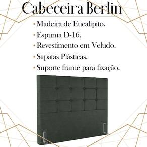 Cabeceira Queen 158 cm Berlin Veludo, ideal para inovar o seu quarto com toque luxuoso e ao mesmo tempo refinado. Estrutura em madeira de eucalipto, que oferece maior durabilidade ao produto. Composta por revestimento em tecido veludo, conta com espuma D-16 de altíssima qualidade, sapatas plásticas e acompanha frames para facilitar a fixação no box, é ideal para colchão Queen de 158 cm. Unindo elementos do design contemporâneo, que proporcionam uma ambientação moderna e com acabamentos sofisticados. Este móvel chegará na sua casa separado em 01 volume.
