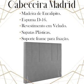 Cabeceira Queen 158 cm Madrid Veludo, ideal para inovar o seu quarto com toque luxuoso e ao mesmo tempo refinado. Estrutura em madeira de eucalipto, que oferece maior durabilidade ao produto. Composta por revestimento em tecido veludo, conta com espuma D-16 de altíssima qualidade, sapatas plásticas e acompanha frames para facilitar a fixação no box, é ideal para colchão Queen de 158 cm. Unindo elementos do design contemporâneo, que proporcionam uma ambientação moderna e com acabamentos sofisticados. Este móvel chegará na sua casa separado em 01 volume.