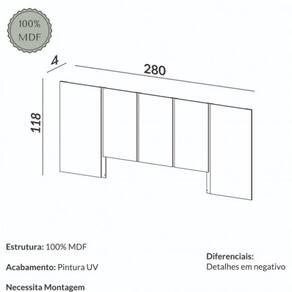 Características: Estrutura 100% MDF Acabamento em Pintura UV Detalhes em Negativo Necessita de Fixação na Parede Ideal para Colchão de Casal (138 cm de largura), Queen (158 cm de largura) e King (193 cm de largura) NÃO ACOMPANHA CAMA NÃO ACOMPANHA COLCHÃO