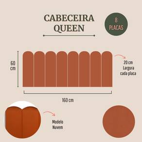 CONFIRA ABAIXO MAIS DETALHES SOBRE O PRODUTO: Tamanho Queen (8 placas): 160cm (comprimento total) x 60cm (altura) x 3 cm (profundidade). Altura de cada placa: 60 cm Largura de cada placa: 20cm Materiais: 100% MDF; Espuma; Fita 3M; Cores e Tecidos: temos 25 variações de cores e tecidos. Escolha a que você mais gosta.