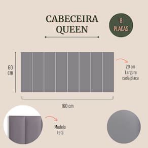 Tamanho Queen (8 placas): 160cm (comprimento total) x 60cm (altura) x 3 cm (profundidade).