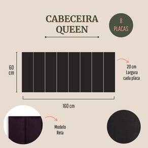 CONFIRA ABAIXO MAIS DETALHES SOBRE O PRODUTO: Tamanho Queen (8 placas): 160cm (comprimento total) x 60cm (altura) x 3 cm (profundidade). Altura de cada placa: 60 cm Largura de cada placa: 20cm Materiais: 100% MDF; Espuma; Fita 3M; Cores e Tecidos: temos 25 variações de cores e tecidos. Escolha a que você mais gosta.