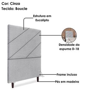 Definição de conforto a Cabeceira Solteiro Cristal foi desenvolvida para agregar mais modernidade e aconchego ao quarto! Com estrutura em Madeira de Eucalipto (reflorestada) e estofada em espuma (densidade D-18), conta com revestimento em tecido Bouclé (macio e texturizado) e detalhe Diagonal na costura. Incluso Frame (metal resistente com reforço lateral e acabamento em pintura epóxi) para fixação em camas Box e pés em madeira maciça (12 cm). Pode haver variação no design do frame dependendo do lote de peças. A função do acessório e usabilidade permanece a mesma. Este produto será entregue em 1 volume.