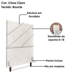 Definição de conforto a Cabeceira Solteiro Cristal foi desenvolvida para agregar mais modernidade e aconchego ao quarto! Com estrutura em Madeira de Eucalipto (reflorestada) e estofada em espuma (densidade D-18), conta com revestimento em tecido Bouclé (macio e texturizado) e detalhe Diagonal na costura. Incluso Frame (metal resistente com reforço lateral e acabamento em pintura epóxi) para fixação em camas Box e pés em madeira maciça (12 cm). Pode haver variação no design do frame dependendo do lote de peças. A função do acessório e usabilidade permanece a mesma. Este produto será entregue em 1 volume.