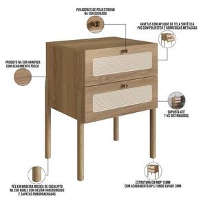 02 gavetas com corrediças metálicas simples e aplique de tela sintética (PVC com poliéster).