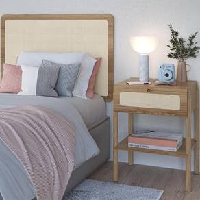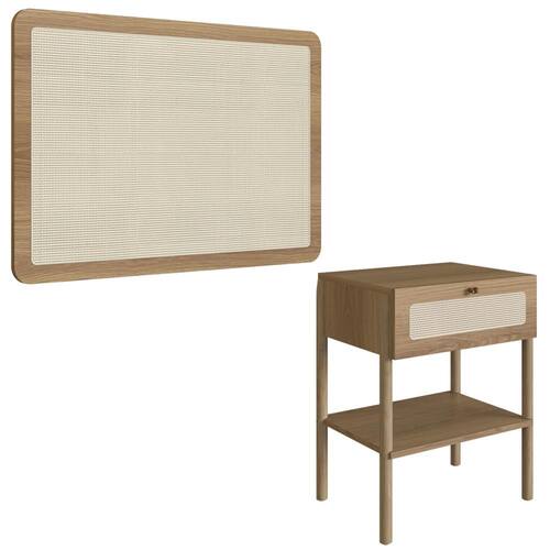 Cabeceira E Mesa De Cabeceira 27975, o conjunto ideal para tornar seu quarto mais elegante! Estrutura em madeira maciça Eucalipto e MDP 15mm com acabamento BP, gaveta com corrediças metálicas (mesa de cabeceira) e detalhes em aplique em tela sintética (PVC) imitando palhinha e puxadores em Poliestireno (dourado). Produto será entregue em 03 volumes.