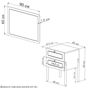 Mesa de Cabeceira: 48 x 60 x 37,5 cm.