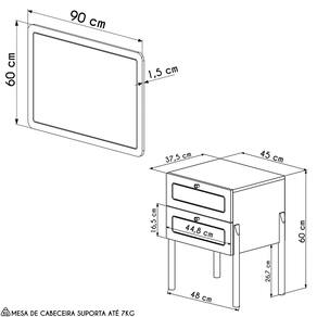 Cabeceira:90 x 60 x 1,5 cm. Mesa de Cabeceira: 48 x 60 x 37,5 cm. Peso:14 Kg.