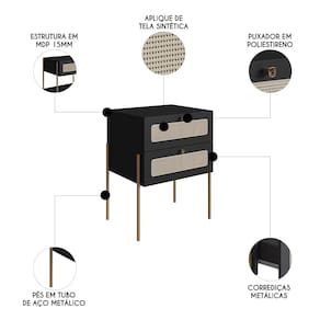 Características do Produto Material da estrutura: MDP 15mm/HDF 3mm. Peso Suportado: 11 Kg distribuídos. Acabamento: BP. Escala de Brilho: Fosco. Possui Pés: Sim. Material dos Pés: Aço metálico. Possui Gaveta: Sim. Quantidade de Gavetas: 2 Gavetas. Tipo de Corrediças: Metálicas. Possui Puxador: Sim. Material do Puxador: Poliestireno. Possui Nicho: não. Possui Porta: Não. Possui Prateleira: Sim. Quantidade de Prateleira: 1 Prateleira. Diferenciais: - Design retrô. - Detalhes de tela sintética. - Intalacão da cabeceira facilitada com suporte metálico. - Cabeceira painel. - Cantos arredondados. Sistema de Montagem: Minifix/Cavilhas/Parafusos. Manual de Montagem: Sim. Complexidade da Montagem: Média. Conteúdo da Embalagem: 1 Cabeceira/ 2 Mesas de Cabeceira. Volumes: 5 Volumes. Garantia do Fabricante: 90 dias contra defeitos de fabricação. Montagem: Recomendamos que seja feita por um profissional. Recomendação de limpeza: Utilize pano levemente úmido.