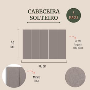 CONFIRA ABAIXO MAIS DETALHES SOBRE O PRODUTO: Tamanho Solteiro (5 placas): 100cm (comprimento total) x 60cm (altura) x 3 cm (profundidade). Altura de cada placa: 60 cm Largura de cada placa: 20cm Materiais: 100% MDF; Espuma; Fita 3M; Cores e Tecidos: temos 25 variações de cores e tecidos. Escolha a que você mais gosta.