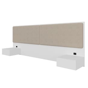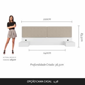 Materiais de Fabricação - Estrutura: MDP de 12mm, 15mm e 25mm - Tecido: Suede - Tonalidade: Branco/Suede Bege - Medida para Cama: 138cm - Mesinha de cabeceira com 1 gaveta cada - Corrediças Metálicas - Cada gaveta suporta até 5kg distribuídos - Tomadas de energia recomendadas para uso de produtos de baixa potência
