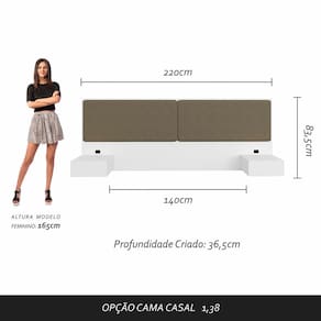 Materiais de Fabricação - Estrutura: MDP de 12mm, 15mm e 25mm - Tecido: Suede - Tonalidade: Branco/Suede Capuccino - Medida para Cama: 138cm - Mesinha de cabeceira com 1 gaveta cada - Corrediças Metálicas - Cada gaveta suporta até 5kg distribuídos - Tomadas de energia recomendadas para uso de produtos de baixa potência