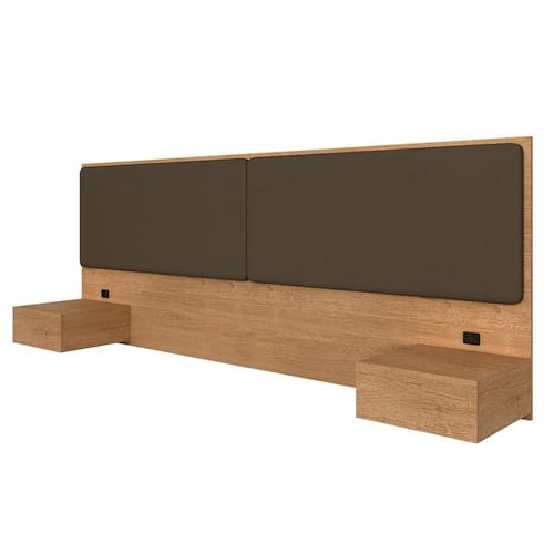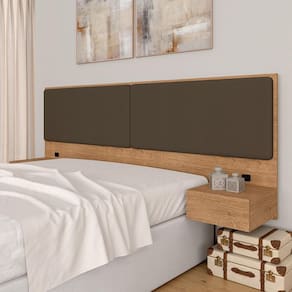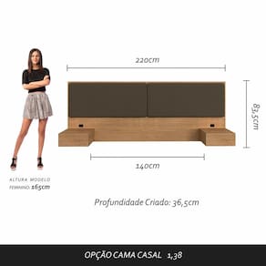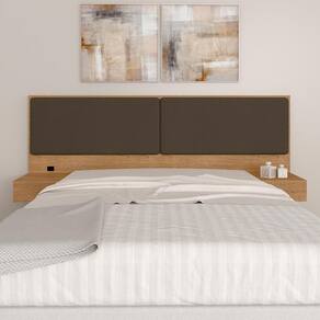 Materiais de Fabricação - Estrutura: MDP de 12mm, 15mm e 25mm - Tecido: Suede - Tonalidade: Carvalho Americano/Suede Marrom - Medida para Cama: 138cm - Mesinha de cabeceira com 1 gaveta cada - Corrediças Metálicas - Cada gaveta suporta até 5kg distribuídos - Tomadas de energia recomendadas para uso de produtos de baixa potência